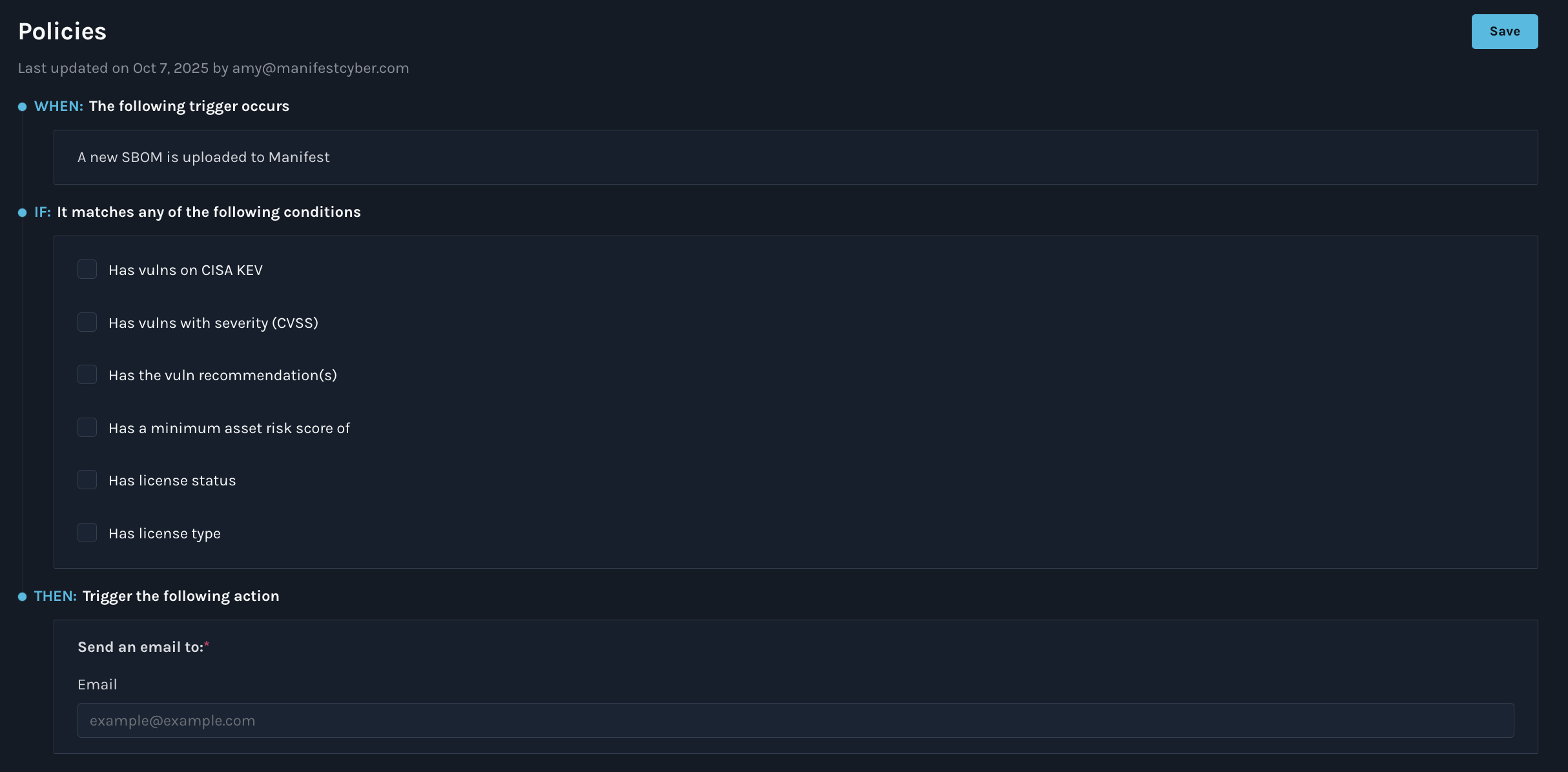 Policies evaluate each newly uploaded SBOM against predefined risk criteria and notify designated recipients when policy conditions are met. This reduces time to detection for vulnerability and license compliance risks.