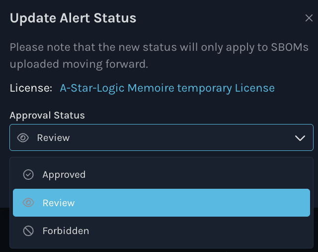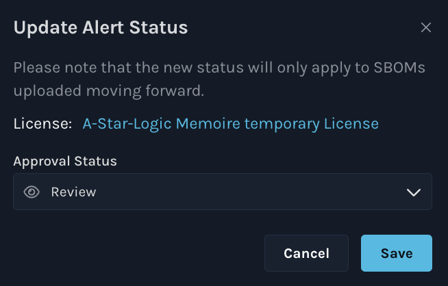 Alert statuses are displayed for any component that contains a license enabling faster decision-making. Note: Updates to a license's status applies only to new SBOM uploads.